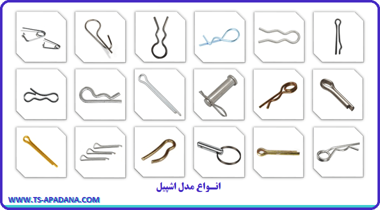 اشپیل به انگلیسی (Split Pin) – (Cotter Pin) میباشدکه تلفظ آن اسپلیت پین و کوتر پین میباشد. و با اضافه نمودن مدل و یا آلیاژ و یا دیگر خاصیت ها به آن زیر مجموعه های آن را نیز میتوان مشخص نمود مانند: